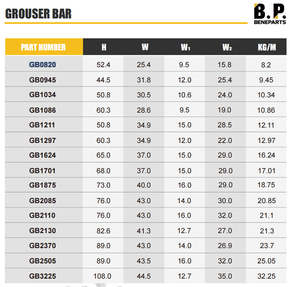 | Номер части | H | W | П1 | П2 | кг/м |